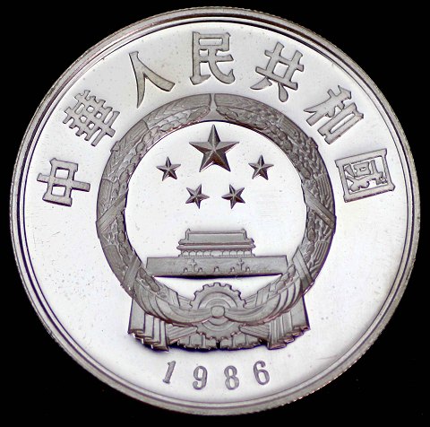 Kina, 5 Yuan 1986 sølv - Buillion. Diameter 36 mm., vægt 22,2 gr. (.900)