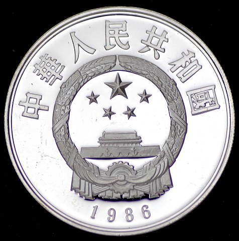 Kina, 5 Yuan 1986 sølv- Bullion. Diameter 36 mm., vægt 22,2 gr. (.900).