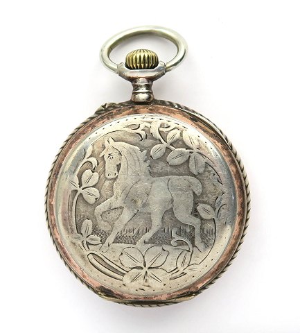Schweizisk lommeur i urkasse af sølv med hvid emailleskive, arabertal og separat sekundviser. Manuel mekanisk optræksværk. Urkasse diameter 48 mm.