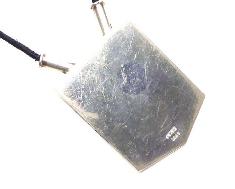 Moderne halssmykke af sterling sølv bestående af justerbar lædersnøre med symbolvedhæng af sterling sølv, foroven prydet med bjælke af ben, indvendig med turkisfarvet, krøllet silkestof. Vedhæng 60 x 40 mm., vægt ca. 32 gr.