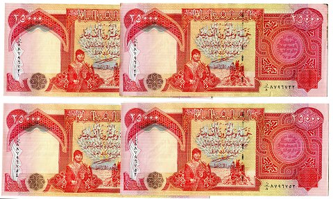 100.000 IRD i 4 stk. 25.000 Dinar sedler, svarende til ca. 84 US. Dollars.