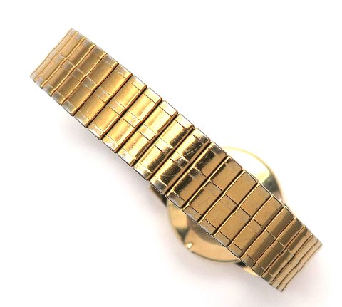 Omega DeVille damearmbåndsur i urkasse af gulddoublé. Champagnefarvet skive bag mineralglas med stregindikation. Quartzværk. Urkasse diameter 24 mm., Fixo-Flex lænke af metal.