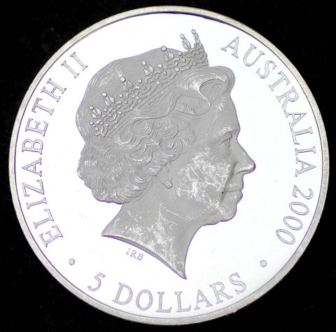 Australien, 5 Dollars 2000 one ounce finsølv - Bullion. Diameter 40,5 mm., vægt 31,6 gr. (.999).