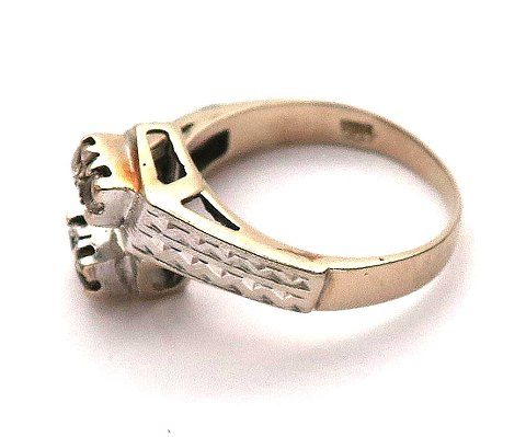 Ring af 14 kt. tofarvet guld med cross-over skinne, prydet med 4 klare, facetslebne safirer. Ring Str. 48½, samlet vægt ca. 4 gr.