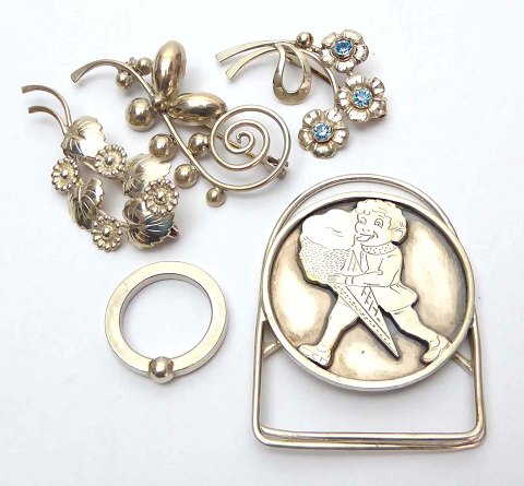 Lot bestående af tre buketformede brocher af sterling sælv, L. 40, 50 og 55 mm., ring med ligesidet skinne af sterling sølv, Str. 55, samt pengeclips med motiv i form af dreng med stor isvaffel, 40 x 55 mm. Samlet vægt ca. 43 gr.