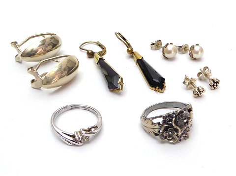 Lot bestående af par ørestikker af forgyldt sterling sælv med prismevedhæng, L. 30 mm., par ørestikker med 6½ mm. perler, par ørestikker med blomsterformet front, par ørestikker med bladformet front, L. 24 mm., ring med blomsterdekoreret front, Str. 50 samt ring med cross-over, stenbesat front, Str. 50. Alle sterling sølv, samlet vægt ca. 17,5 gr.