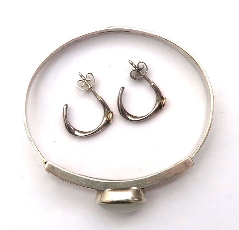 Armring af sterling sølv med fleksibel skinne, prydet med mælkefarvet, cabochonsleben kvarts samt par ørestikker, prydet med facetsleben sten, L. 18 mm., samlet vægt ca. 19,5 gr.