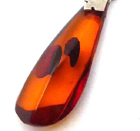 Vedhæng af sølv, prydet med ravprisme med flere millioner gamle indeslutninger i form af blade. L. 50 mm., vægt ca. 4 gr.