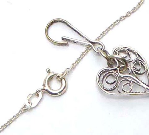 Lot bestående af filigran armlænke med hjerteformede led, L. 19 cm. samt halskæde med filigrankors. L. 46 cm. Begge af sølv (.835). Samlet vægt ca. 11 gr.