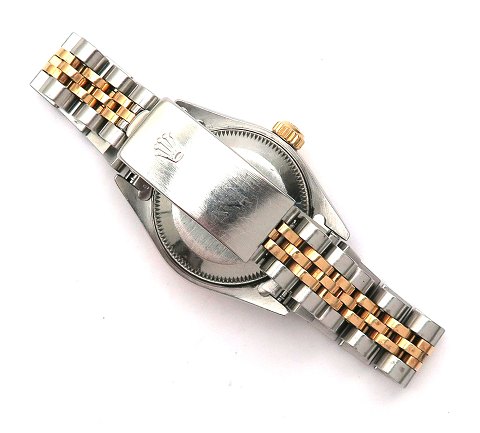 Rolex Datejust damearmbåndssur, ref. nr. 69173 i urkasse og med foldelænke af guld/stål. Champagnefarvet skive bag mineralgas med stregindikation, central sekundviser og datovisning i #3 position. Automatisk værk. Urkasse diameter 26 mm.