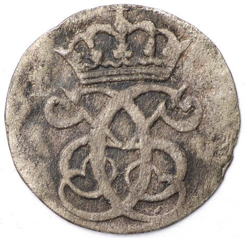 Christian 5., 2 Skilling 1686 sølv, blomster ved værdital, diameter 18 mm., vægt 1,2 gr. (.343).