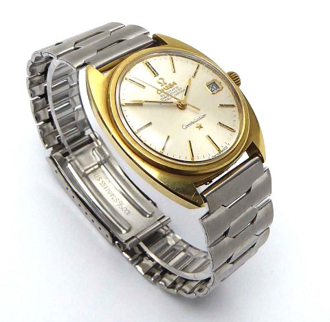 Omega Constellation Automatic herrearmbåndsur, reg. nr. 168.017 i urkasse af gulddoublé/stål og med foldelænke af stål. Metallicgrå skive bag plexiglas med stregindikation, central sekundviser og datovsning i #3 position. Automatisk værk kaliber 564. Urkasse diameter 35 mm.