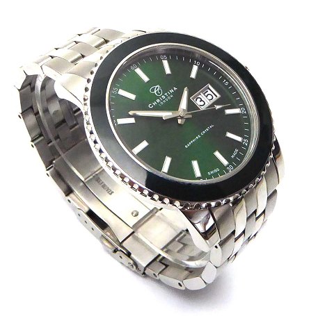 Christina of London herrearmbåndsur, ref. nr. 5101149 i urkasse og med lænke af stål. Flaskegrøn krans og skive bag safirglas. Stregindikation, central sekundviser og dag/datovisning. Schweizisk ETA quartzværk. Urkasse diameter 45 mm.