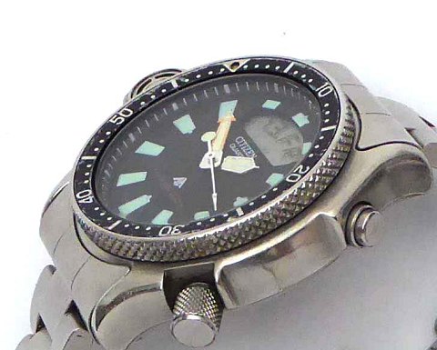 Citizen analog/digitalt dykkerur, ref nr. C125 - 00371 i urkasse og med foldelænke af stål. indstillelig lynette. Sort skive bag safirglas med stor, selvlysende stregindikation, central sekundviser samt dag/datovisning, alarm, stopur, dybde måler med 0,1 meters interval, Hukommelse for max dybde, dykkertids alarm, dybde alarm, alarm ved for hurtig opstigning - digitalvisning. Quartzværk. Urkasse diameter 40 mm.