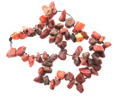 Lot diverse, ubehandlede ravstykker, heraf en del trukket på snøre. Størrele mellem 10 - 25 mm.