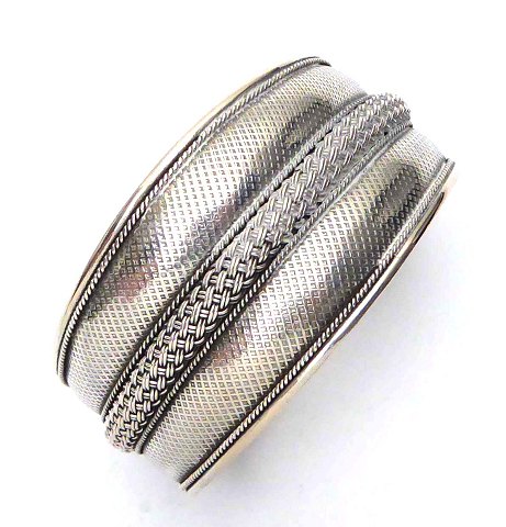 Armring af sterling sølv med front i forløb, prydet med flettet snøre, struktur og perlebort. Indvendig 62 x 50 mm. med fleksibel åbning. Vægt ca. 38 gr.