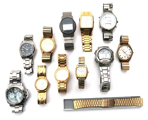 Lot bestående af 11 forskellige armbåndsur, heriblandt et Omega damearmbåndsur med uoriginal lænke samt en ny Casio urlænke. Urene er i rimelig stand, men skal efterses og delvis repareres samt forsynes med nyt batteri - ebuy.dk garanterer ikke for funktionaliteten.