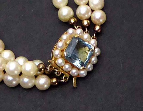 Treradet perlecollier med 6½ mm. perler, prydet med lås af 18 kt. guld og facetsleben akvamarin, 10 x 10 mm., omkranset af 3 mm. perler. Kæde L. 38 cm., samlet vægt ca. 72 gr.