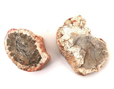 2 opskårne og ensidig slebne, fossile træfragmenter, fundet på Madagaskar. Str. ca. 45 x 35 mm. Tidsfæstet ca. 180 mio. år gamle.