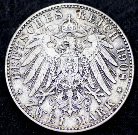 Freie und Hansestadt Hamburg, Zwei Mark 1908 sølv, diameter 28,2 mm., vægt 11,1 gr. (.900).