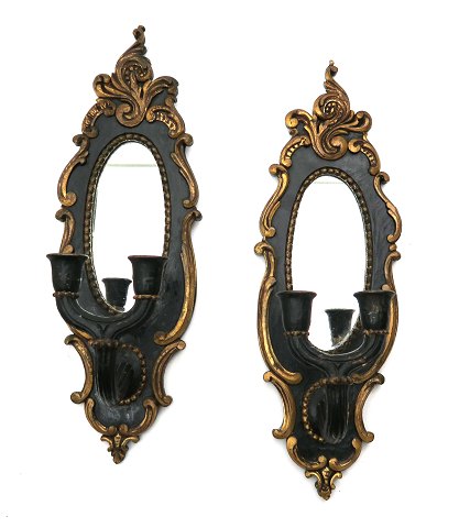 Par antikke, italienske vægspejle af guldbemalet træ. skåret i barokform med volutter og perlebord. 20. årh. begyndelse, H. 52 cm.
