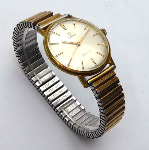 Omega Genéve Vintage herrearmbåndsur fra 1960'erne i urkasse af gulddoublë. Champagnefarvet skive med stregindikation og separat sekundviser. Manuelt mekanisk optræksværk. Urkasse diameter 34 mm. Fixo-Flex lænke me defekt led.