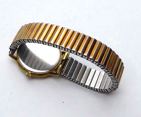 Omega Genéve Vintage herrearmbåndsur fra 1960'erne i urkasse af gulddoublë. Champagnefarvet skive med stregindikation og separat sekundviser. Manuelt mekanisk optræksværk. Urkasse diameter 34 mm. Fixo-Flex lænke me defekt led.