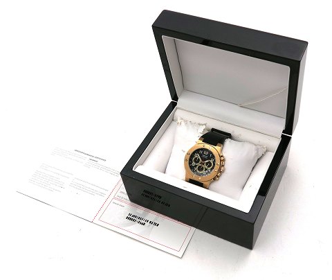 Vanceur Royal Castle Chronograph herrearmbåndsur i urkasse af guldtonet stål. Sort struktureret skive bag mineralglas med arabettal og stregindikationer, central og separat sekundviser, 12/24 timer visning samt datovisning i #4½ position. Quartzværk. Urkasse diameter 40 mm. Gummirem med foldespænde.