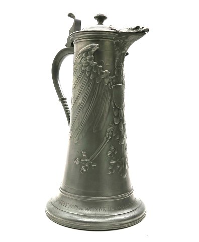 Tysk lågkande af tin i Kaiser Wilhelm form, dekoreret med ørn og inskription. H. 35 cm. Meisterzinn 20. årh.