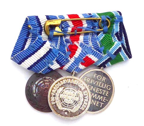 Danmark, miniaturemedaljer for tro tjeneste i Hjemmeværnet af cu, FN tjeneste af sølv og tjeneste på Cypern af sølv. Alle samlet på på tre forskellige ordensbånd, diameter 2x 17,5 mm. og 16 x 19 mm.