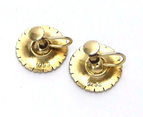 A. Michelsen, par øreskruer af forgyldt sterling sølv, marguerit med amaljebelagte kronblade. Front diameter 17 mm., samlet vægt ca. 5,5 gr.
