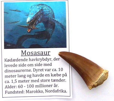 Fossil tand fra hav dinosauren ”Mosasaurus”, en daværende, ca. 10 mtr. lang kæmpe rovfisk.