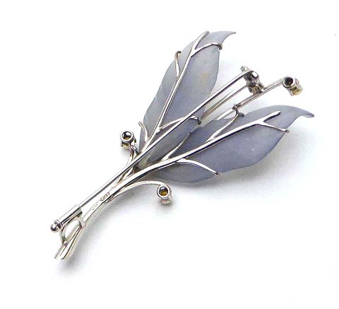 Designbroche af 14 kt. hvidguld, prydet med sartblå kvartsblade og 6 stk. 3 mm. perler i kronefatning. L. 70 mm., vægt ca. 12 gr.