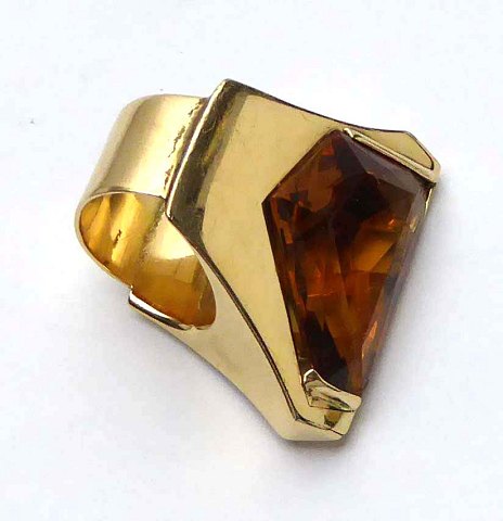 Jet Set ring af 14 kr. guld med høj, tresidet front, prydet med facetsleben citrin og 5 brillantslebne diamanet, tilsammen ca. 0,50 ct. Ring Str, 50, samlet vægt ca. 23 gr.