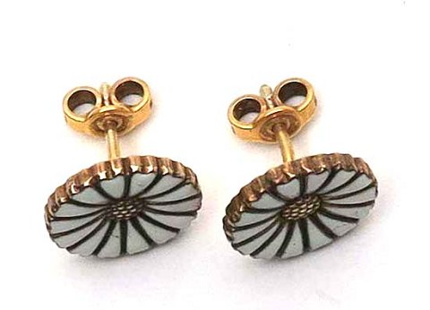 Par ørestikker af 8 kt. guld, marguerit med emaljebelagte kronblade. Front diameter 10 mm., samlet vægt ca. 3,5 gr.