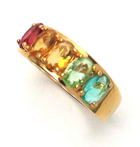Multi colour ring af forgyldt sterling sølv, prydet med forskelligt farvede, facetslebne sten. Str. 59, samlet vægt ca. 5 gr.