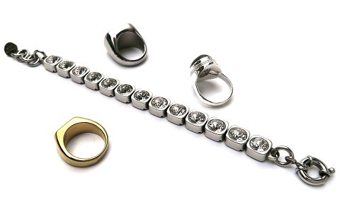 Lot bestående af Dyrberg/Kern armlænke med 13 led, prydet med facetslebne sten, L. 20,5, Ring af guldtonet metal, Str. 59, Pilgrim ring af blankpoleret metal, prydet med oval, olivenfarvet kvarts, Str. 59, samt ring af poleret metal, prydet med stor, facetsleben sten, Str. 53½.