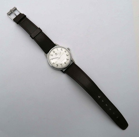 Omega Genève Vintage herrearmbåndsur, ref. nr. 135.012 i urkasse af blankpoleret stål. Rillet metallicgrå skive bag plexiglas med arabertal og central sekundviser. Manuelt mekanisk optræksværk nr. 25078092, kaliber 601. Urkasse diameter 32 mm. Original Omega læderrem med metalspænde.