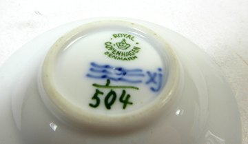 Royal Copenhagen Kuvertaskebæger nummer 504, musselmalet halvblonde. Askebægeret har en diameter på 7cm.