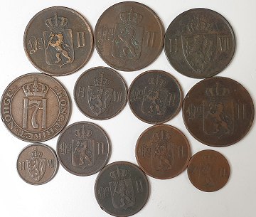 Norge. Årgangsmønter. 1 øre - 5 øre bronze. 1876-1912. (12)