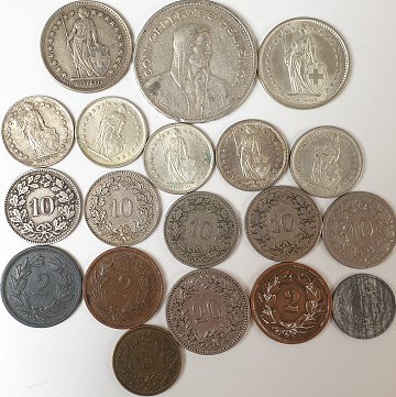 5 Francs sølv 1932. 1 Franc sølv 1944, 1966. ½ Franc sølv 1950, 1961, 1962, 2x 1965. 20 Rappen nickel 1902. 10 Rappen cn 1895, 1907, 1913, 1915, 1919. 5 Rappen messing 1918. 2 Rappen bronze 1932, 1937, zink 1944. 1 Rappen zink 1946.