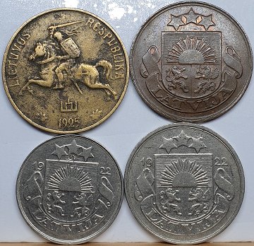 Letland og Litauen, 5-10-20 santimu 1922 og 20 centu 1925. Dejligt sæt. Blandede metaller.
