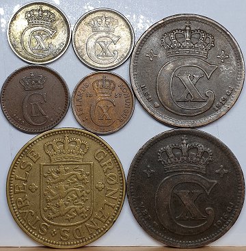 Skandinavisk møntlot, 7 mønter 1899-1937. Danmark - 1 øre 1899, 5 øre 1916 + 1919, 10 øre 1914 + 1919. Grønland - 1 krone 1926. Island - 1 eyrir 1937