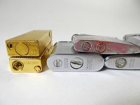 Fremstår med brugsspor og to af lighterne med graveringer.