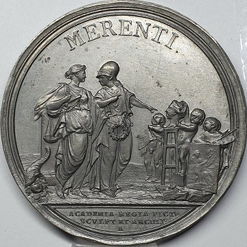 "Bagsiden med Overskriften MERENTI (til den fortjenstfulde) viser Retfærdigheden, der staar i Begreb med efter Minervas Forslag at overrække Kransen til en af de tre Puslinger, som foreviser Arbejder i Bygningskunst, Billedhuggerkunst og Maling. - Den 24. Marts blev der leveret v. Haven 54 Dukater til Prægning af 3 Guldmedailler (651) Og Ugedagen efter blev Medaillen første Gang uddelt til Peder Als (652). - Senere paa Aaret prægedes yderligere 10 Guld- og 34 Sølvexemplarer. Den 24. Maj fik Arbien sit Arbejde betalt med 300 Rd., hvorfra blev draget 200 Rd., han havde faaet i Forskud ved Nytaarstid (653)."