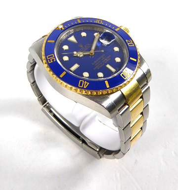 Rolex Submariner af 18kt guld og stål. Uret har en 40mm kasse af stål, som er monteret på en oysterlænke af 18kt guld og stål med glidelock-clasp. Uret har en lynette af 18kt guld med et blåt keramisk indlæg. Urets skive er en flat blue dial, med indeks og visere af 18kt guld, datoangivelse i 3. indeks.