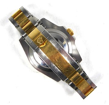 Rolex Submariner af 18kt guld og stål. Uret har en 40mm kasse af stål, som er monteret på en oysterlænke af 18kt guld og stål med glidelock-clasp. Uret har en lynette af 18kt guld med et blåt keramisk indlæg. Urets skive er en flat blue dial, med indeks og visere af 18kt guld, datoangivelse i 3. indeks.