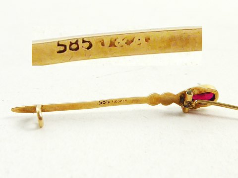Nål med rød sten: Stemplet '585 J&A'. Længde ca. 4,2 cm.