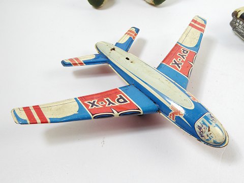 Lot med fire dele vintage legetøj: en bamse, to biler, en flyvemaskine