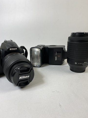 NIkon d5000 spejlreflekskamera, to kameralinser henholdsvis Nikon dx af-s nikkor 55-200mm og Nikon dx af-s nikkor 18-55mm, ekstern blitz, Hama kamerataske og diverse kabler.